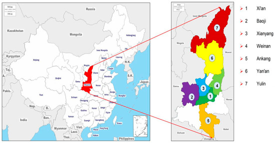Data for this study were collected through enterprise field questionnaires. The research samples were from Xi’an, Baoji, Xianyang, Weinan, Ankang, Yan’an, and Yulin in Shaanxi Province, as shown in Figure 2. The main respondents were middle and senior management personnel of industrial enterprises (see in Table 7). Metallurgy, textiles, chemicals, medicine, construction equipment, machinery manufacturing, communication electronic equipment, and other industries were covered by the survey. The pre-survey for the study was conducted from March 15 to March 22, 2019. A total of 50 questionnaires were distributed, and 38 valid questionnaires were returned. Twenty-five questions were set according to the six potential variables in the questionnaire, namely, paradox cognition, green product supply, green production technology, green production management, corporate potential performance, and corporate financial performance. The aforementioned pre-survey was an important reference for the design of the formal survey questionnaire. The formal survey for the study was conducted from April 10 to May 20, 2019. A total of 350 questionnaires were distributed, and 305 valid questionnaires were returned. All questions in this questionnaire were declarative, and respondents could indicate their degree of recognition of the questions in the questionnaire as per the specific conditions of the enterprise. In this questionnaire, at least three observation variables were set for each potential variable (facet). Options designed in the questionnaire were measured by the Likert Scale [34]. Scores were arranged from the lowest to the highest, indicating the degree of recognition from low to high, specifically, 1 (completely disagree), 2 (disagree), 3 (slightly disagree), 4 (unsure), 5 (slightly agree), 6 (agree), and 7 (fully agree) [34]. According to the recommendation of Hair et al. [35], in the process of structural equation modeling, the ratio between the number of samples and the number of observed variables should be between 1:10 and 1:15, and the appropriate number of samples is from 200 to 400. A total of six facets and 25 questions were contained in the model established in the study. Hence, 305 samples were used to meet the structural equation modeling sample size requirements.