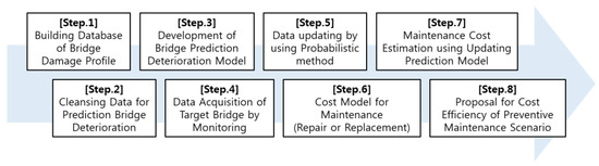 In this paper, a new preventive bridge maintenance method is proposed using the monitoring technologies that can be applied to determine the condition of the bridge by the early detection of damages during the actual use of bridges with high accuracy. First, a deterioration model has been developed by each bridge member based on the bridge’s aging characteristics. Second, we have considered a particle filtering technique based on the Bayesian approach with which the performance changes of the target bridge that is in use can be accurately predicted by incorporating the monitoring information into the probability characteristic values of the deterioration model (the mean and standard deviation). Third, we presented a maintenance cost analysis model by linking the repair and reinforcement method application probability with the repair and reinforcement method cost model using the rating of the target bridge. Additionally, we determined the economic effect in terms of the lifecycle cost efficiency of the deterioration model-based preventive maintenance scenario, which was renewed by the particle filtering technique, when compared to the existing maintenance scenario of the target bridge that is currently in use. Figure 1 shows a detailed development process of the proposed method for preventive management by eight steps.