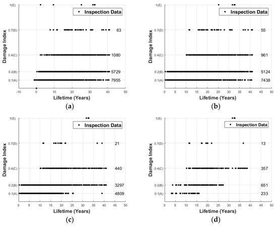 Figure 2a is an example of PSCI girder condition rating data, in which the collected data of the relevant member is expressed in a graph. This data includes the cases where the condition has been improved as a result of an action, and is 15,578 data for 1092 bridges. Figure 2b is the data created by removing the data of the negative lifetime and overlap data. Figure 2c is the data created by removing the data of the condition improved as a result of repair action and the condition profile after that are removed from the condition rating data. It can be seen that the number of rating B data decreased from 5124 to 3297, and the number of the bridges decreased from 1092 to 915. Lastly, Figure 2d shows the data processed to have only the data with two of more condition profiles as it is insufficient to grasp the tendency inclination of deterioration if only one datum exists in each condition profile. It can be seen that the number of rating A data is reduced from 4809 to 233, the number of rating B data 3297 to 651, the number of rating C data from 440 to 357, and the number of bridges also decreased from 915 to 84.