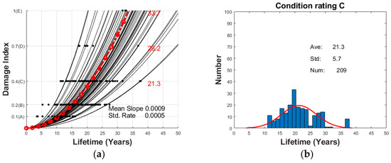 Figure 3 indicates the result of regression analysis for each rating of condition history and life-time distribution of the regression equation by C grade. Moreover, the standard deviation rate was calculated in order to consider the uncertainty of the predicted damage index. In this study, the target bridge (to be discussed in detail in Section 4) was the Mokdo Bridge whose superstructure was PSCI girder, which required the development of a deterioration model for the PSCI girders. Further, we performed the regression analysis of the performance history data using each bridge that comprised the PSCI girder among the national highway Type 1 and Type 2 bridges; subsequently, we calculated each deterioration slope. Additionally, to develop the deterioration model using no maintenance action owing to the accelerated deterioration in time, the low rating would result in the acceleration of the deterioration of damage index; we conducted the regression analysis on bridges whose condition history was C or less (D, E grade). This would allow for the realistic implementation of the deterioration characteristics of the aged bridges in operation.