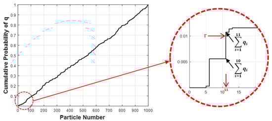 In Equation (14), can be reselected by this procedure, expressed in Figure 5. The relative likelihood q displays the measurement data. Therefore, when using this procedure, highly probable data are reproduced and those are selected first than other smaller probable data, it means small-weighted data are eliminated and large-weighted data are reproduced. Then, at the next step, the existing particles are replaced by the new particles (N times repetition).