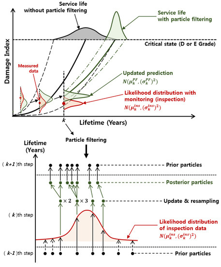 As described in the textbook written by Simon D. [19], the particle filtering technique is a more advanced version of the Bayesian updating based on big data analysis [20]. This technique has been well adapted to nonlinear problems such as the estimation of fatigue crack growth for asphalt concretes [21] and rail wear in Seoul metro [22]. In order to apply the particle filtering technique to the problem considered in this paper, we have set the equations: