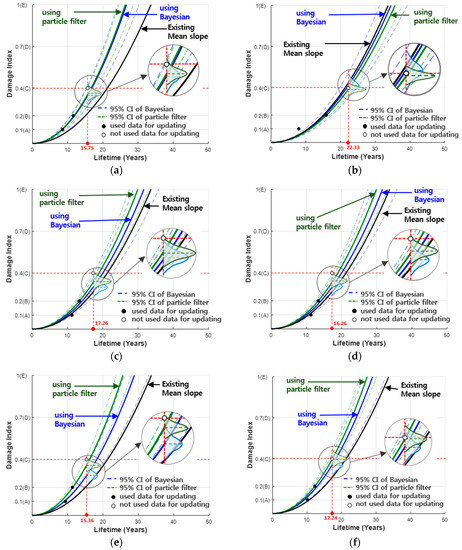 The updated parameters, a, and D.I are used for the prediction of deterioration. When the probabilistic characteristic is not given, a uniform distribution is usually applied to the initial distribution [21,22]. The boundaries for the uniform distribution of a was selected based on the regression analysis slope for inspected data and uncertainty ratio of data. The coefficient of variation (C.O.V) of the relative likelihood is assumed to 16%, which is the white noise in Equation (10) [23,24,25]. The which is damage index prediction can be obtained with a regression analysis by the particle filtering technique using 1000 (a thousand) particles. The application and verification to the model for the prediction will be shown by the inspection data considered from two measurements of each bridge. In Figure 7, for the more intuitive examination, the 95% confidence interval (CI) of each updating model is presented by the slope which included mean and standard deviation, and the comparison results of prediction uncertainties between using the particle filter and Bayesian method are presented. Comparing the prediction slope or 95% confidential interval and the actual bridge inspection data shows that the prediction model using particle filtering is more reasonable than not only the existing model but also the Bayesian updating prediction model.