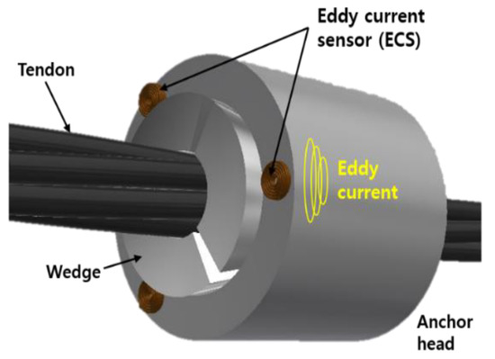 The eddy-current sensor (ECS) technique generates eddy current on a target surface through a magnetic field, and investigates the eddy current variation with condition changes of the target surface. The magnetostriction effect is defined as a variation of the magnetic permeability due to an alteration of stress level in ferromagnetic materials. Through it, the stress levels of the wedge surface alters its magnetic permeability, causing an amplitude variation of the eddy current on post-tensioning (PT) anchorage. The tension force loss detection ECS technology detects the variation of tension force on PSC bridges, and prevents large accidents and casualties that are caused by the tension force reduction. The ECS technique has many advantages (low cost, simple installation, low power consumption, and automatic warning) [23,26,27].