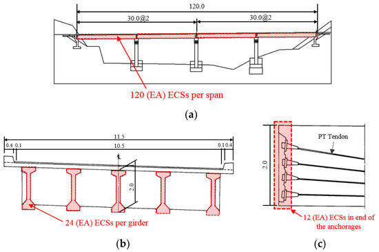 The installation locations of ECSs in the Mokdo Bridge. (a) The longitude section view. (b) The cross-sectional view. (c) The edge of beam detail.