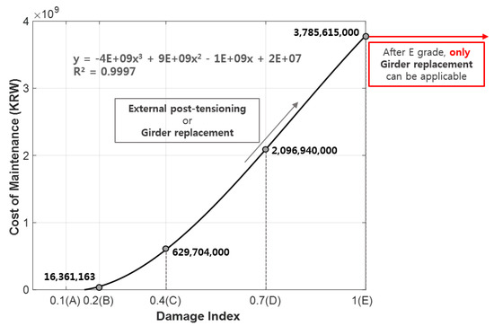 Meanwhile, we developed a condition rating improvement model using the condition rating improvement data of the repair and reinforcement list calculated using the results of the maintenance record DB of KICT BMS and also based on the specialists’ opinions [28]. In this study, we determined three major repair and reinforcement methods (Table 6) applicable to exposed, corroded tendons and tendon fractures and linked these three methods to each condition improvement cost. Figure 10 depicts the maintenance cost per condition rating of the PSCI girder of the Mokdo Bridge and whose cubic polynomial curve tendency is based on the regression analysis of the cumulative maintenance cost per rating. Here, the cost rapidly increases with the low rating (D, E grade), and this is because the low rating (D, E grade) causes the application of methods with a high unit cost, including external post-tensioning and girder replacement [28]. Moreover, the cubic polynomial regression function is shown in Figure 10 based on Table 6.