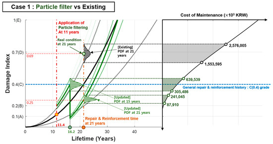 According to Case 1 in Table 7, the total maintenance cost for 21 years before and after the particle filtering update was calculated by Equations (16) and (20), denoting approximately 50% of the cost-saving effect. If the updated mean condition () is larger than the existing prediction condition (), the reasons for such maintenance cost saving (−999,216,166 KRW) are as follows.