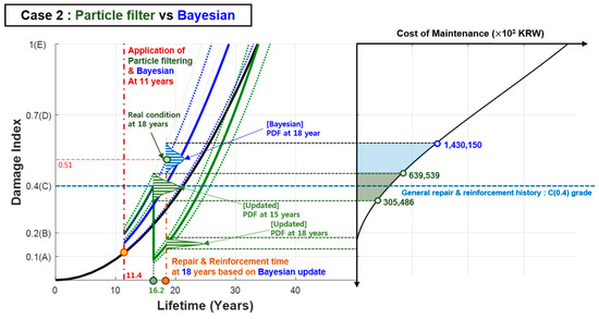 - According to the example in (Section 5.3) for calculating the maintenance cost, which was considered in this study, the maintenance level of the bridge (rating) was set to C rating (0.4), and the particle filter update was performed for a specific time (eleven years). Case 1 showed a steeper slope when compared to that of the existing deterioration model, resulting in approximately 50% of the maintenance cost-saving effect. This was because the proposed model detected damage types, such as pre-stressed tendon, which could be difficult to detect using the existing visual inspection and nondestructive inspection, and allowed for the early prediction of posterior damages and the subsequent one-time preventive repair and reinforcement.