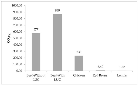 Given the similarities between Colombia and Brazil regarding beef production, the carbon footprint used was 28 kg of CO2eq emissions per kg of carcass weight at the production phase (in a scenario that does not include land use change), and 44 kg of CO2eq per kg of carcass weight (in a scenario that includes Land Use Change) [36]. Post-farm gate CO2eq emissions for beef corresponded to 3.7 kg of CO2 per kg of consumed beef [35]. Thus, the total carbon footprint of beef, not including LUC, was 31.7 kg of CO2eq per kg of carcass weight, and including LUC was 47.7 kg CO2eq per kg of carcass weight. Beef had the highest carbon footprint of the food types compared in this study.