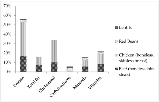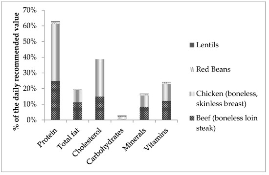As for vitamins, our results show a significantly higher content of niacin per 100 g of chicken when compared to 100 g of the plant-based options evaluated, but no significant differences with the content of niacin in 100 g of beef loin (p < 0.05). We found a significantly higher content of folate in 100 g of the plant-based alternatives versus the content of folate in 100 g of the animal-based options, with red beans having a higher content of this nutrient when comparing it to the other three alternatives (p < 0.05). Regarding vitamin A, our results show that 100 g of chicken have a higher content of this nutrient when compared with beef or red beans but not with lentils (p < 0.05). No statistically significant differences were found in the values per 100 g of vitamin C, thiamin, riboflavin, and vitamin B12 (p < 0.05). Notwithstanding, it is relevant to consider that 100 g of beef loin provides a quantity of vitamin B12 that exceeds the RDA. The average per capita consumption of the two animal-based alternatives provides 7% of the RDA for thiamin, 19% of the RDA for riboflavin, 67% of the RDA for niacin, 2% of the RDA for folate, 66% of the RDA for vitamin B12, and less than 1% of the RDA for vitamin A. The average per capita consumption of the two plant-based alternatives evaluated provides 3% of the RDA for thiamin, 1% of the RDA for riboflavin, 1% of the RDA for niacin, 4% of the RDA for folate, and has no contributions to the RDA for vitamin B12 and vitamin A. In Colombia, 18.1% of the population between 5 and 12 years old is at risk of vitamin B12 deficiency, and 13.2% of women between 13 and 49 years old present with vitamin B12 deficiency [11]. Figure 3 shows the contributions of each food alternative to the recommended daily value for nutrients.