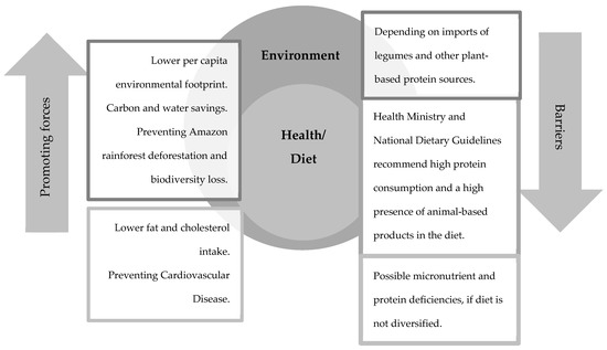 This study adds to the discussion on sustainable diets by exploring the environmental and health/nutrition dimensions of meat consumption reduction in an emerging economy. Through the nutrition ecology framework, it was possible to address this complex issue in an integrative manner [31]. To the best of the author’s knowledge, this is the first time this has been explored in an emerging economy, characterized by a growing middle class that consumes increasing amounts of animal protein, at the same time that key ecosystems are put at risk. An increased consumption of animal food products and the transition towards a diet high in animal fats and low in fruits and vegetables in the country calls for the promotion of sustainable food choices and diets. This, according to the literature, should focus on the reduction in meat consumption [7,10,51,52,53]. The nutrition ecology framework [31] allowed an integrative approach to the possible impacts of a reduction in meat consumption in the country, and permitted joining the discussion about sustainable diets and consumption choices [54] (see Figure 4). In this section, we analyze the promoting forces and barriers of beef consumption reduction in the country.