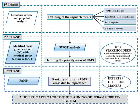 This paper describes the development of such a holistic approach to UMS planning, which enables strategic decisions to be taken with the involvement of various stakeholders. The suggested innovative methodology is based on the FAHP model combined with the well-known SWOT (Strengths, Weaknesses, Opportunities, and Threats) analysis, where a modified method of focus groups (FG) processed by the nominal group technique (NGT) is also involved. The FG method, through a carefully defined series of discussions with stakeholders, gains perceptions of a particular area of interest [58]. This way, information about the opinions, perceptions, attitudes, beliefs, and attitudes of a small group of key participants can be obtained. Based on modified FG results, SWOT and FAHP methodologies can be further conducted. Within the framework presented in this paper, the mix of SWOT and FAHP is particularly essential. Namely, the hierarchical structure of the FAHP model is defined with the identified basic elements (and sub-elements) of the SWOT analysis, i.e., with strengths, weaknesses, opportunities, and threats of the UMS planning. By deploying such a methodological combination, it becomes possible to obtain opinions from a wide range of stakeholders and to design priority areas, which are then ranked by their relevance. This way, a more holistic solution for solving UMS problems is achieved, where various urban mobility subsystems are integrated through a wider circle of stakeholders. Furthermore, the presented methodology allows for defining the priority areas, which are the base for the development of scenarios and the adoption of strategic decisions. To the best of our knowledge, the approach introduced in this paper has not been detected in the existing literature yet, particularly within the field of UMS planning. The developed model is tested for a case of a real-life application, where the achieved results confirm the model’s practical value, considering a holistic approach to UMS planning. On these grounds, it is believed that a novel approach might have brought some important contribution to the field of UMS planning.