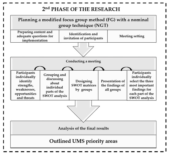 The second phase was more detailed, as illustrated in Figure 2. Within the first step, planning of the method implementation, the content, and the open-ended questions was carried out. Selected participants and the moderator were informed about the content, wherein the moderator additionally needed to familiarise themselves with the participants and the modified method of focus groups with NGT. The next step was meeting with the participants. The goal of participants meeting was to present the current state-of-the-art in the UMS field and to identify key priority areas of UMS. Afterwards, the moderator gave the material to the participants, where each one independently identified and formulated what the strengths, weaknesses, opportunities, and threats of the chosen UMS were by using the NGT method.