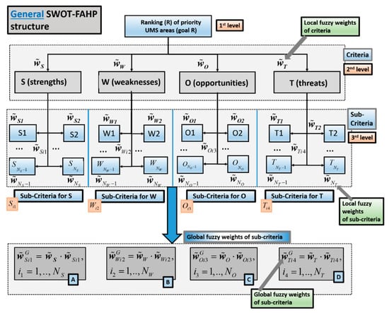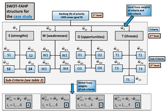 After conducting the SWOT analysis and obtaining the key priority areas of UMS, the FAHP method could be engaged. This made it possible to rank the priority areas by their relevance, which is essential since not all goals from all areas can be simultaneously achieved, and one cannot deal with all areas at the same time. When performing the FAHP method, experts who knew the UMS area and its limitations could be present during this process and had the chance to take decisions or represent the decision-makers. Here, a particularly important goal was to follow the previously obtained SWOT group criteria under those priority areas obtained from the previous stages of research. On this basis, a hierarchical structure with local fuzzy weights of criteria with respect to the goal, sub-criteria with respect to the criteria, and global fuzzy weights of sub-criteria with respect to the goal arose, as shown in Figure 3. Such a construction represents the general structure of the SWOT–FAHP hybrid model as a core part of our research. Weights in Figure 3 refer to aggregated weights of all decision-makers, either via their reflection for the criteria, or the sub-criteria. When the obtained fuzzy weights were defuzzified into the crisp numbers, the KPA of UMS could also be appropriately ranked by their relevance.