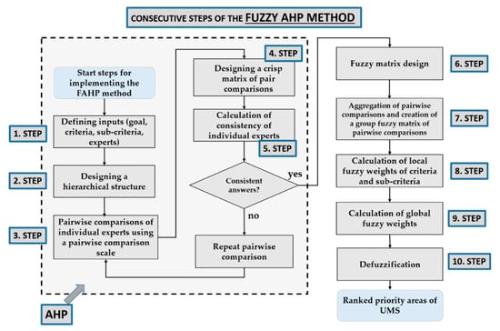 In the next section, some details of the consecutive steps of the FAHP method from Figure 4 will be briefly explained.