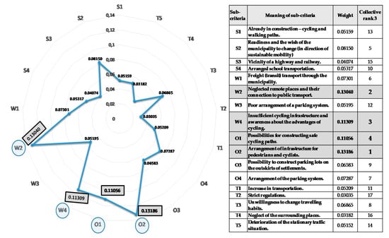 where are the fuzzy pair comparisons of the h-th group of criteria/sub-criteria, while m is the number of decision-makers. For the sake of simplicity of explanation, the calculated values symbolize either the elements of the joint fuzzy matrix of pairwise comparisons of all m decision-makers for N = 4 criteria (S, W, O, T) or the elements of the N joint fuzzy matrices for the corresponding M sub-criteria (where —see Figure 3).