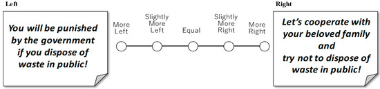 Pair-wise comparisons were prepared among these six statements. We compared two statements at a time. Consequently, we obtained 15 comparisons (6C2 = 15 comparisons). The six statements were shown in the questionnaire (Figure 2). A respondent was asked which statement they were more likely to follow when they encounter the statement in public areas, such as streets, parks, and markets. A five-point scale consisting of “more left”, “slightly more left”, “equal”, “slightly more right”, and “more right” (statement) was used, indicating between the two choices.
