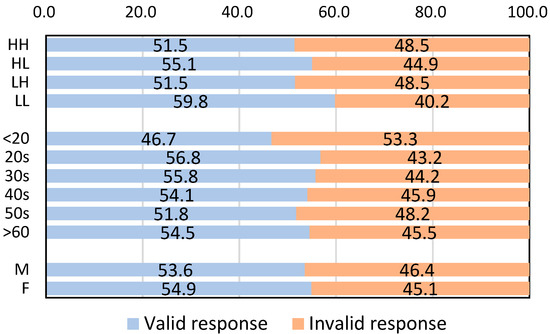 Percentage of valid and invalid samples in each socio-demographic group. HH, HL, LH, LL: Surveyed region shown in Table 1, < 20 to > 60: Age, M: Male, and F: Female. Valid response: CI ≤ 0.15, Invalid response: CI > 0.15.