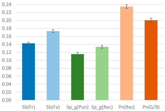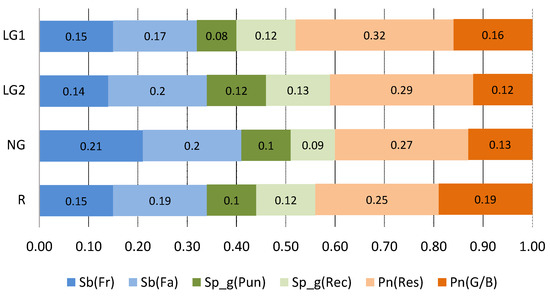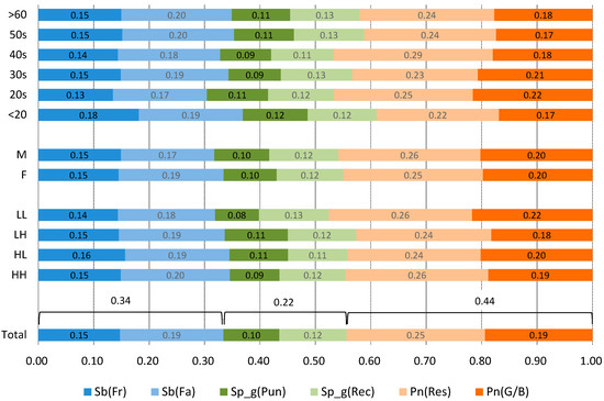 Figure 4 shows the average score weight of each statement of all valid respondents (n = 221). The Pn was the highest score among all interventions especially Pn focusing on responsibility (Pn(Res)). Figure 5 shows the score range of each statement. Pn(Res) shows the highest score range, comparing with the other statements, with quantile range of 0.18–0.30 and median 0.24. The Sp_g was the lowest among all, especially for pressure involving punishment (Sp_g(Pun)), in which the quantile range was 0.06–0.16 with the average 0.11 and median 0.09. The social pressure from family members (Sb(Fa)) was slightly higher than that from friends (Sb(Fr)). The quantile range of Sb(Fa) was 0.15–0.19 with median 0.17, and correspondingly for Sb(Fr) was only 0.12–0.17 and 0.15.