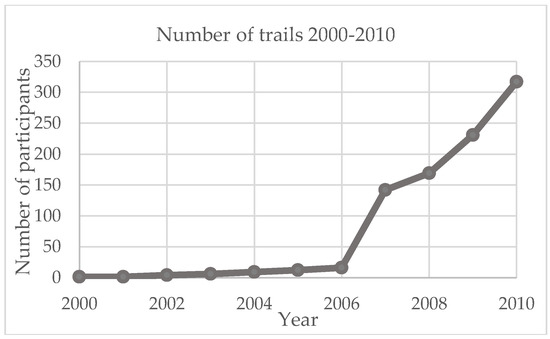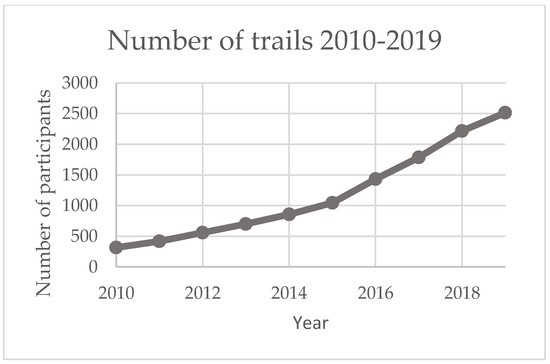 5]. The ITRA database shows that in 2007, the first year with published data, there were 142 races in the world. This number increased to 2510 in 2019. In the case of Spain, in 2007 there were only 13 trail races. This figure was boosted to 230 in 2019, which means eighteen times more races than in 2007.
