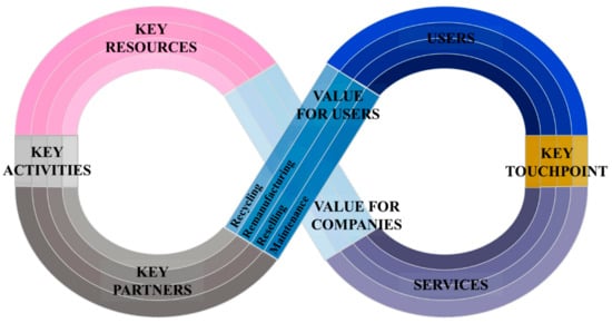 Another fundamental feature for CBM visualization tool is the possibility to be easily adapted to every product and industrial sector. In this way, the model can be used to develop innovative CBMs without limitations in value proposition and customer segment, as in the case of BMC. The requirement of being able to adapt to all products and sectors is a novelty for CE diagrams. The CBM archetypes proposed by Accenture, MoonFish and EIT Raw Materials cannot represent for example bio-based products, since they cannot be reintroduced in the same circle at the end of their life, but only disposal might be possible. Only the EMA Foundation model considers the difference between the pathways of biological and technical materials, but this clear distinction does not accurately reflect the real situation. In fact, biological and technical materials can be linked in some points of the value chain—for example, for bio-based product transport and storage. Moreover, the distinction between the two material typologies is not always strictly defined: for example, biomaterials can be transformed into polymers that are not biodegradable and require the same management as a technical product [100,101].