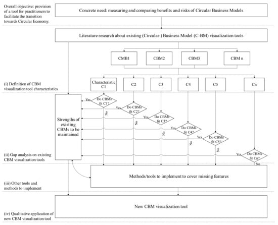 When one or more new or existing business models are evaluated and compared, practitioners (e.g., design entrepreneurs, managers, R&D personnel…) must be able to fully visualize, analyze and estimate all the elements and requirements, to have an overview on the main benefits and risks of a potential innovation. Due to the complex and numerous elements required in a CE (knowledge, expertise, technologies, internal and external relationships…), it is difficult to standardize the CBM evaluation process. Consequently, it is difficult for practitioners to explore, replicate or improve circular initiatives since they cannot collect comparable elements to evaluate benefits and risks in different scenarios. Starting from the need to evaluate and compare innovation focused on CE, the overall objective of this paper is the definition of a new CBM visualization tool, able to provide a standardization of the elements to be evaluated to overcome the main barriers of CE and boost its practical implementation. The methodology used for this purpose consists of four main phases, which aim to provide a practical response to the described need, integrating literature research in relation to different questions.