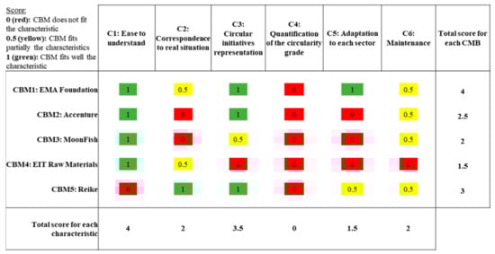 A gap analysis is presented in this paragraph to evaluate the existing CBM visualization tools in relation to the identified characteristics. The aim is to evaluate the ability of the current tools not only to explain and circulate CE concepts, but also to boost its implementation in practical actions. A numeric score and a color code is assigned to assess how the specific CBM archetype fits the features, selecting from three types of rating to keep the evaluation simple: a score of 1, corresponding to the green color, indicates that the characteristic is well represented by the CBM; a score of 0.5, represented by the yellow color, means that the CBM partially complies with the required characteristics; a score of 0, in red color, indicated a mismatch between the characteristic and the CBM. The scoring process is based on the previously described considerations. The final score is calculated, both for each CBM visualization tool and for each characteristic, as the sum of the single scores. Figure 7 lists the available CBM visualization tools and analyzes them in relation to the six described characteristics, providing the results of the gap analysis.
