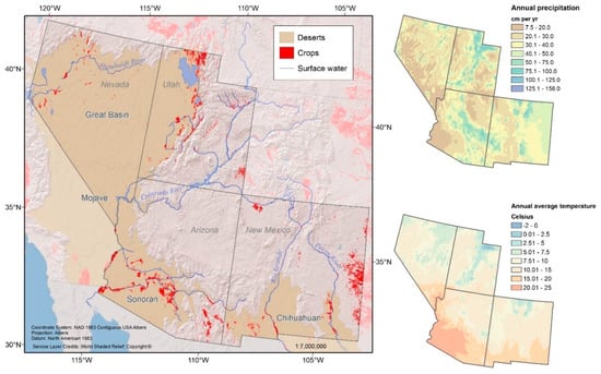 Crop production regions of the Southwestern United States (red) with 1981–2010 Climate Normals [22].