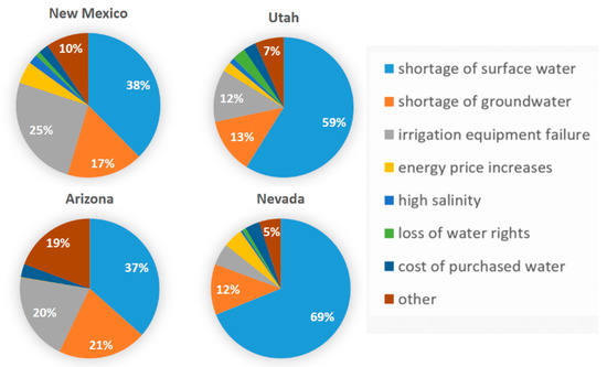 While adequate storage capacity exists to store surface water in a network of reservoirs, often only a small fraction of available capacity is used due to limited water availability arising from recurrent and persistent droughts. Decreases in reservoir storage in the four reservoirs along the Canadian River have been attributed to declines in rainfall since 1990 [28]. A survey of SW farmers indicates that diminished yield due to irrigation interruption is often caused by surface water shortage (38% to 69% of the total in 2013), groundwater shortage (12% to 21% of the total), and irrigation equipment failure (5% to 25% of the total), with the remaining generally attributed to a variety of other causes (National Agricultural Statistics Service 2015) (Figure 2).