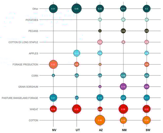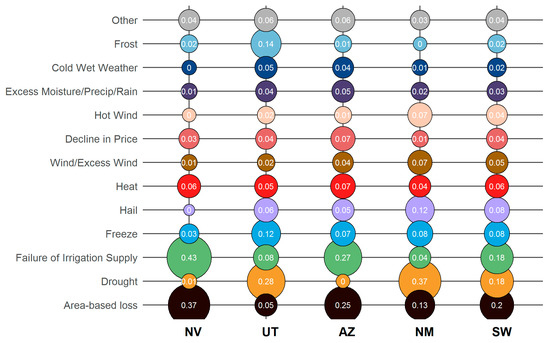 Relative fraction of aggregated indemnities by the top 12 regional causes of loss from 1989- 2017. The size of the individual bubbles represents the contribution of specific causes of crop loss by state and for the Southwest region.
