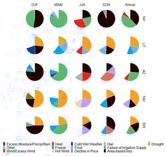 On a state-by-state basis, the leading COL related to weather were drought (28% in UT and 37% in NM) and lack of water (e.g., failure of irrigation supply; 27% in Arizona and 43% in Nevada). Utah is more susceptible to COL from cold weather (frost, 14%; freeze, 12%, cold wet weather, 5%) than the other states. On a seasonal basis, lack of water and freeze are most prevalent in the spring whereas hail, heat, and drought are more prevalent in the summer (Figure 4). Drought was reported as a consistent COL during each season in both NM and UT. Decline in price was only a top COL in AZ in the fall.