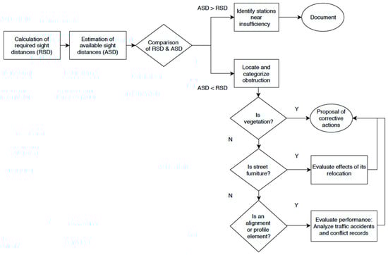 SSD and the ISD. In those sections where sight distances requirements are not met, an extra step is carried out so as to determine the nature of the obstructing elements. If the obstructing element belongs to vegetation, pertinent solutions are proposed. If the obstructing element belongs to street furniture or road assets whose functioning is location-related, an evaluation of their repositioning is performed so as to find their optimal location in terms of visibility. On the other hand, if the obstructing element is the road geometry itself, an examination of historical conflicts or accidents near the location is proposed, in order to evaluate if troublesome geometry modifications or speed changes are truly required.