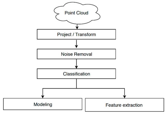 Figure 3 shows the main processing steps required by the point cloud in order to deliver the DTM and the 3D objects. The point cloud was firstly referenced to the desired coordinate reference system. Subsequently, points that were the product of abnormal measurements or dynamic objects were removed. After this denoising, points were classified according to the element they belong to. These classes could be ground, edification, road utility, high vegetation, medium vegetation, noise and so forth. Depending on their classification, they were used to make one model or the other.