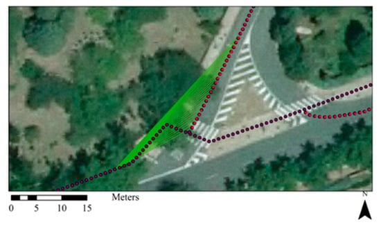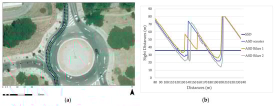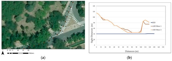 Results of the second evaluation exposed the distinctive effects vegetation had on the considered trajectories. Despite the fact that the observers were considered to be in the same lane and only two meters apart from each other, cyclists’ ASDs showed differences of up to 10 m. As abovementioned, different guidelines expose specific locations where to consider the trajectory of drivers when calculating the ASD. When it comes to riders, due to the fact that they could take almost any position in the lane, evaluating only one possible trajectory could deliver misleading results. The same could be said about electric scooter riders, whose presence continues to increase in the road scene. Evaluating the overall sight distances of these users on existing roads is fundamental, due to the fact that many cities are fostering and encouraging more sustainable modes of transportation without a proper evaluation of how these roads perform for VRUs.