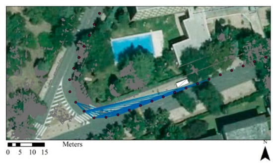 Table 1 showed the considered eye height for each observer as well as their placement. As mentioned, main observers are pedestrians with mobility impairments and without them, cyclists and personal transportation device riders. Each of these users travel in differentiated areas of the road scene. This analysis considers the eye height as the only differentiating factor between mobility impaired pedestrians and those who are not. Cyclists were considered to be sharing the roadway as well as using cycling facilities. When evaluated as sharing the roadway, two trajectories were depicted from the center of the lane. This is done owing to their meandering trajectory, for which they could occupy almost any position of the lane. Electrical scooter riders were considered to be sharing the roadway. Due to the fact that these devices require fewer meandering movements than bikes, these observers were only located in the center of their lanes. All these trajectories could be digitized from exiting cartography, obtained from official sources of geospatial data or from voluntary geographic information projects. Additionally, real trajectories of shared mobility services ran by city councils are often available in widespread formats. Trajectories were then discretized into a set of equally spaced stations. For drivers, cyclists, and riders the separation between points was 5 m. Pedestrians were represented by equally separated stations of 1 m, this separation considers the average pedestrian stride and common wheelchair measurements.