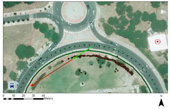 The third evaluation considered observers to be electric scooter riders and cyclists. This roundabout encompassed cycle paths and cycle routes. However, cyclists with higher expertise and confidence tend to share the roadway, in spite of having a dedicated infrastructure, for that reason the trajectories of cyclists were also evaluated in the roadway, one meter apart from the center of the lane, as with the previous cases. This case showed how these VRUs did not have enough visibility of the traffic approaching the minor road. Visibility restrictions caused by the entry angle are meant to discourage motorists from speeding, but in the case of VRUs it imposes a visibility restriction.