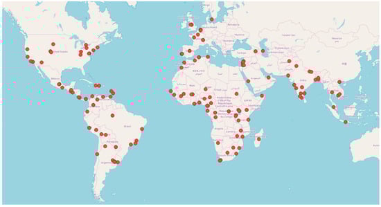 The research includes both international and local NGOs considering their geographical scope of intervention. Main international development organizations have IMOs responsible for the management of these tools. On the contrary, small local organizations might not be able to afford the necessary resources. Therefore, both realities should be considered. They could serve the community as external stakeholders or themselves be part of the receiving community [31,33]. The research was conducted globally to avoid country or culture-related biases. Purposive sampling techniques [35] were used to identify NGOs from several databases (i.e., OnGood by the Public Interest Registry formed by the Internet Society, Civil Society Organizations System developed by the UN Department of Economic and Social Affairs, Organizations listed in The Idealist, Forus network of National NGO Platforms and Regional Coalitions, Latin American Network Information Center, Participants Of The Netzkraft Movement, Civil Society in the Commonwealth of Nations, and the Non-Governmental Organization Network of the Global Environment Facility). In the second stage, other networks and partners of the initial sample were used to identify further NGOs within the target population. NGOs that might have disaster management as their main activity were disregarded. The survey was online for three months from September 2018. The resulting sample of 2684 NGOs was contacted by email or contact forms on the organization’s website, with a description of the study and a link to the questionnaire. In order to increase the sample size, the invitation to participate in the study requested to cascade the call to include further NGOs within the target population. From 383 responses to the questionnaire (over 14% of the number of development NGOs contacted), partial replies were disregarded and only completed replies were considered for analysis. The analysis of the Internet Protocol (IP) address of the device used to complete the questionnaire led to dismissing further answers to avoid duplications. The final sample was therefore 204 answers. This sample was considered representative of the target population in view of the characterization of the participants and their geographical location as shown in Figure 3. Data was anonymized and treated in an aggregated way. Therefore, all responses remained confidential.