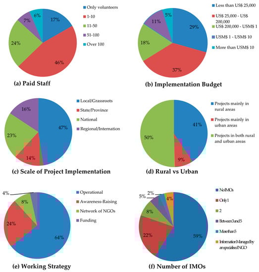 Characterization of the participants in the study based on (a) Number of Paid Staff, (b) Annual Implementation Budget, (c) Scale of Implementation of the Projects, (d) Implementation of Projects in Rural or Urban areas, (e) Working Strategy and (f) Number of IMOs.