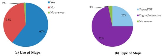 (a) Percentage of participants using geographic information in the form of maps. (b) Use of geographic information in pdf/paper format vs. digital/interactive.