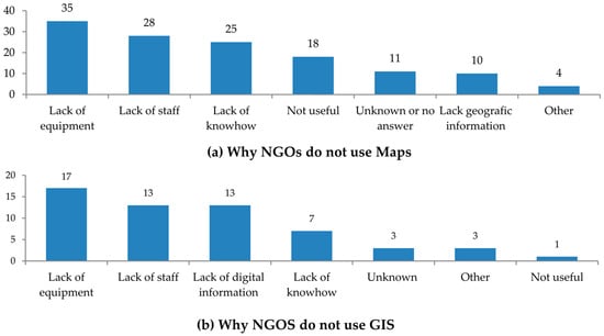 There is a substantial percentage of development NGOs (38% of the sample that amounts to 78 participants) that do not use geographic information in the form of maps for their work, as Figure 5a shows. The main reasons not to use geographic information are the lack of equipment followed by the lack of staff and know-how. Further reasons are described in Figure 6a.