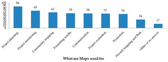 As for the 123 participants using geographic information in the form of maps, the main use is project planning and monitoring as shown in Figure 7. It is also interesting to note the high number of NGOs involved in community mapping (62 development NGOs are involved in this task which means 56% of map users). Among the “other” uses, there are some NGOs (6 participants) using maps for some type of research. Maps are considered necessary and/or useful by the participants using them. When asked about the reasons to use maps, 87 participants answered that maps are necessary while 82 considered them useful. There is also a certain number of development NGOs (21 participants) that use maps because donors request them. Nevertheless, none of the participant NGOs claimed donor request as the only reason to use maps.