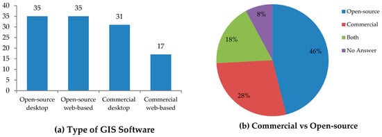 Open-source was expected to be an interesting option for development NGOs. The study confirmed this point. Figure 8a displays the types of software used by the development NGOs. Thirty-five participants stated desktop open-source, with a similar number using web-based open-source, as the GIS software used for the management of geographic information. Analyzing these answers in the context of the 89 participants using geographic information in digital format, Figure 8b shows the percentage of users of open-source vs. commercial software. From the results, it might be established that open-source software is the preferred option (41 development NGOs rely exclusively on open-source software and 16 more use it together with commercial options).