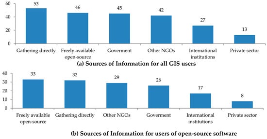 The sources of geographic information considering the 89 participants using digital maps are displayed in Figure 9a. It is interesting to find that gathering the information directly is the main source. Open-data, governmental data, and data obtained from partner organizations are almost equally used. When only considering the sub-set of 57 participants that use open-source software (in some cases together with commercial software), the use of open-data gains importance as shown in Figure 9b.