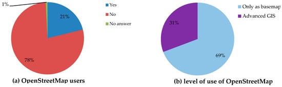 (a) Percentage of participants using OpenStreetMap among the users of maps and (b) percentage of the level of use for those users.