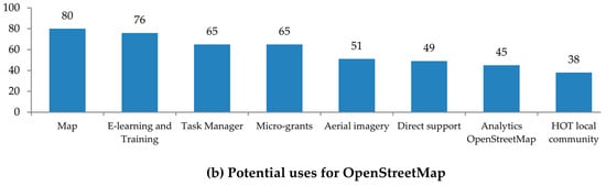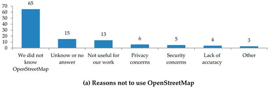 From the 123 NGOs using geographic information in the form of maps, only 26 participants (21%) use OpenStreetMap as displayed in Figure 10a. If the sub-set of 57 users of open-source software is considered independently, the percentage of OpenStreetMap users rises to 26% (15 participants). From the 26 users of OpenStreetMap, 69% (18 participants) recognize that the main task is just as a basemap (see Figure 10b).