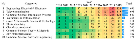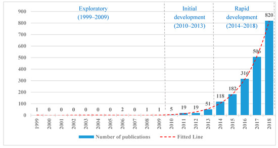 - Exploratory stage (1999–2009): Only five publications were found at this stage. The earliest one was published in City with the title: “Smart Cities—The Singapore Case” [35]. This paper describes the measures taken by the government of Singapore to adapt to the inevitable movement from an industrial to an information economy. In the late 1990s, the term of the “smart city” was proposed as a way of coping with urban population growth and solving problems of economic and social development, construction of urban infrastructure, quality of life, and environmental ecology in the process of urbanization [36]. Singapore’s “Smart Island” project was a typical example of smart-city construction during this period, emphasizing the integration and management of important pieces of urban infrastructure, urban public-resource optimization, security monitoring, and risk management by way of modern information technology [35].