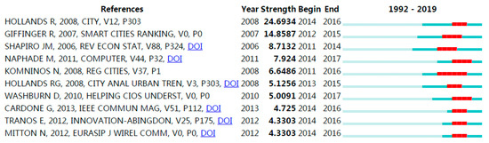 - Through document co-citation analysis, the main research topics of smart-city research have been identified and divided into the categories of “the concepts and elements of the smart city”, “the smart city and the Internet of Things”, and “the smart city of the future”. This paper analyzes the most widely cited classical literature in three areas: “the concepts and elements of the smart city” [3,49,50]; “the smart city and the Internet of Things” [4,51,52]; “the smart city of the future” [38,53,54]. For examining development trends for literature in this field, CiteSpace software was used to analyze the literature in the field of smart cities using burst-detection. In looking at the 10 highest-burst pieces of literature, it was found that between 2011 and 2017, researchers paid more attention to human resources and environmental sustainability while conducting vertical excavation of technology.