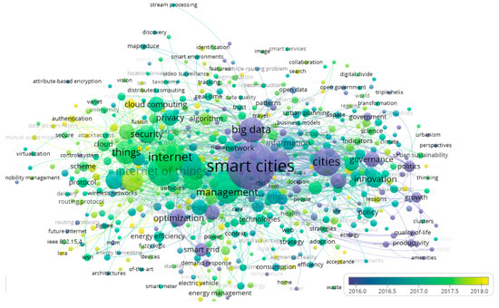 - Rapid development stage (2014–2018): In this stage, the results of research have been rapidly emerging, and more than 100 papers are being published every year. The average annual growth is 175. Especially since 2016, the number of documents has risen sharply. With advances in computer technology, research on smart cities based on computer science continues to receive attention. Simultaneously, in terms of management, urban planning [13], the environment, and other aspects, research into the smart cities has continued to emerge, gradually forming a fusion across disciplines and industries to establish a smart-city research network [38]. The focus of this research has begun to shift from network-technology innovations and applications [4] to the economies, societies, cultures, ecological environments, and use of energy resources in smart cities [13]—that is, from a focus on hardware that values urban infrastructure to one on software that focuses on human and social capital [39]. In this way, the studies of smart cities have continued to evolve.