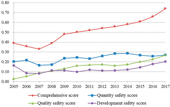 Data for the indexes applied in this paper are from the period of 2005 to 2017. Data for the indexes in the quantity safety sub-system (A) came from the China Statistical Yearbook for the corresponding year (2006–2018); data during 2005 to 2012 for food pass rate in spot checks (Q1) came from the official website of the China Association for Quality Inspection (http://www.chinatt315.org.cn), and data during 2013 to 2017 from the official website of the State Administration for Market Regulation of the People’s Republic of China (http://www.samr.gov.cn); data for pass rates of pesticide residue in vegetables (Q2) and pesticide residue in aquatic products (Q3) came from the Routine Monitoring of the Ministry of Agriculture on the Quality of Agricultural Products (http://www.moa.gov.cn) of the corresponding years; data for the ratio of quality and safety complaints about agricultural means of production (Q4), ratios of quality and safety complaints about food commodities (Q5), and ratios of quality and safety complaints about catering services (Q6) from Almanac of the Industry and Commerce Administration of the People’s Republic of China of the corresponding years (2006–2018); data for total crop acreage per capita (D1), proportion of watershed lakes with water quality of Class III and above (D2), and proportion of seas with water quality of Class II and above (D3) from China Statistical Yearbook on Environment of the corresponding years (2006–2018); data for fertilizer application per crop acre (D4), pesticide application rate per crop acre (D5), and ratio of water-saving irrigation area to farmland irrigation area (D6) from China Rural Statistical Yearbook of the corresponding year (2006–2018).