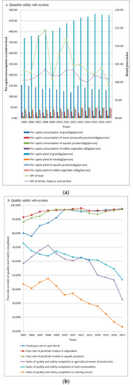 The quality safety sub-system is relatively complicated without much previous experience from which to draw. This paper took the following factors into account. (i) Food pass rate: Food pass rate can accurately show the status quo of food safety under government supervision, so it is mostly regarded as a critical index by scholars in different countries to measure the effect of supervision. However, due to the large volume of data, pass rate in spot checks were usually applied in researches [27]. (ii) Pesticide residue: Pesticide residue is a severe food safety issue [28], but relevant safety information on pesticide residue on food falls into the category of “credence good” and could not be evaluated empirically [29], and therefore needs strict government supervision. Among the five development goals in the National Plan for Food Safety During the Period of the Thirteenth Five-Year Plan issued by the State Council in 2016, three (food safety spot checks, abatement of agricultural pollution sources, and the establishment of food safety standards) are related to pesticide residue. This indicates that pesticide residue is an integral part of food safety supervision in China, based on which this paper chose the pass rates of pesticide residue in vegetables and aquatic products as two indexes. (iii) Indirect consumer evaluation: In the food market, a typical buyer’s market, consumers’ evaluations of quality safety could show the quality safety indirectly via their purchase behavior when they repurchase the same food or directly reflect the quality safety via complaints. During consumption, food commodities and catering services all need to address quality and safety issues. In this case, this paper selected “ratios of quality and safety complaints about food commodities and catering services” as the index of indirect consumer evaluation. In addition, the “ratio of quality and safety complaints about agricultural means of production” was selected as an index, as the source of food production would yield an impact on the quality safety via production.